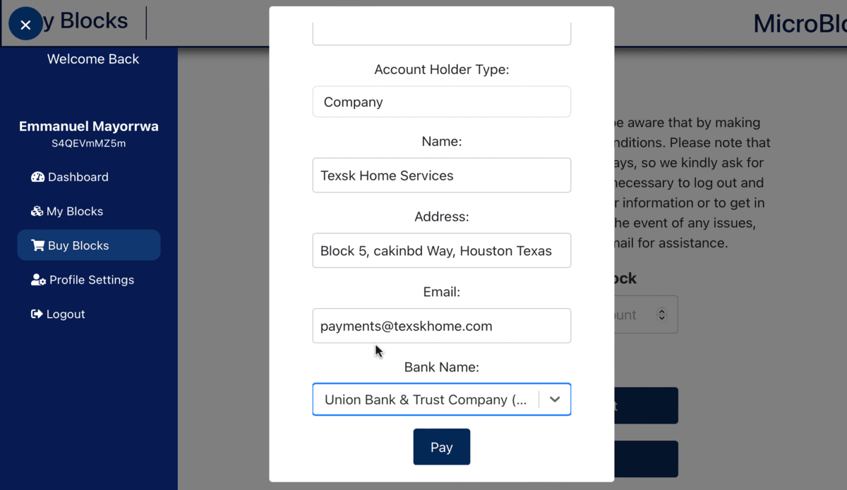 The current rotation consists of a limited supply of 5,000 blocks. This implies that the maximum number of blocks in circulation at any given time is restricted to 5,000 units. A user can purchase 1 or more blocks and seat back to watch his ROI build up. The integrated payment gateway is Stripe